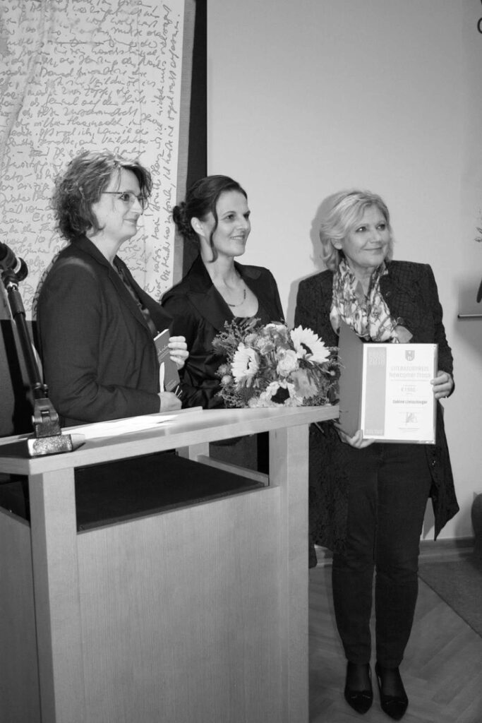 Preisverleihung mit Gabriele Russwurm-Biró (Präsidentin des Kärntner SchrifstellerInnenVerbandes), Rhonda Lamberty (Mitte) und Maria-Luise Mathiaschitz (Bürgermeisterin von Klagenfurt)
